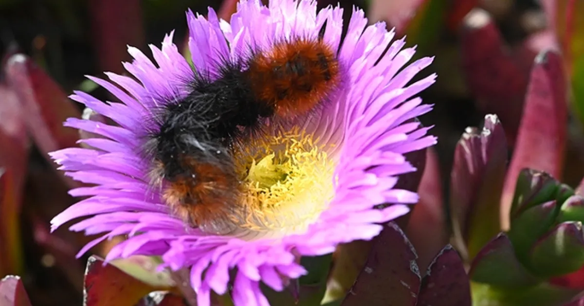 A wooly bear caterpillar investigating an ice plant on Bodega Head, Sonoma County, in April 2022.(Photo by Kathy Keatley Garvey)