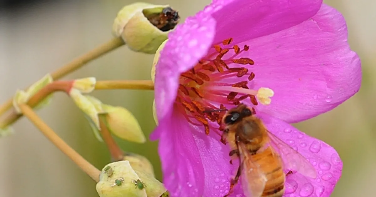 As the rain lets up, a honey bee buzzes into a rock purslane blossom for a sweet shot of nectar.