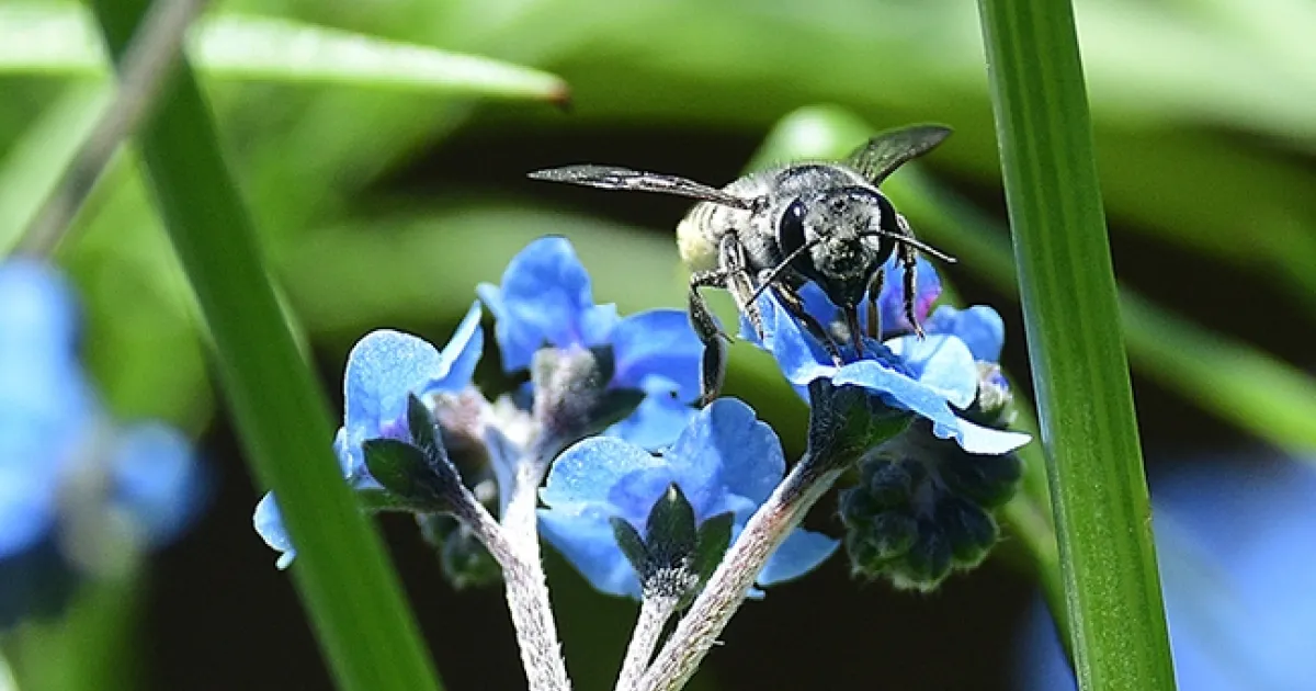Hello there, little leafcutter bee! Yes, you, foraging on the sky-blue Chinese Forget-Me-Nots!