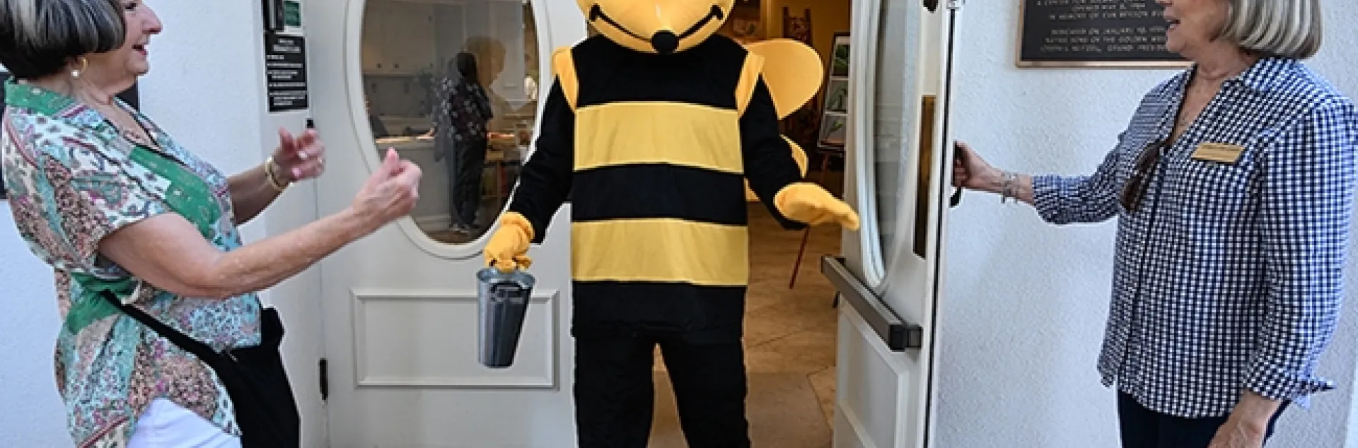 Hear that buzz? The Honey Bee (Dr. George Stock) enters the courtyard. With him are Vacaville Museum Guild members Georganne Gebers (right) of Vacaville, and Sharon Walters of Dixon. (Photo by Kathy Keatley Garvey)