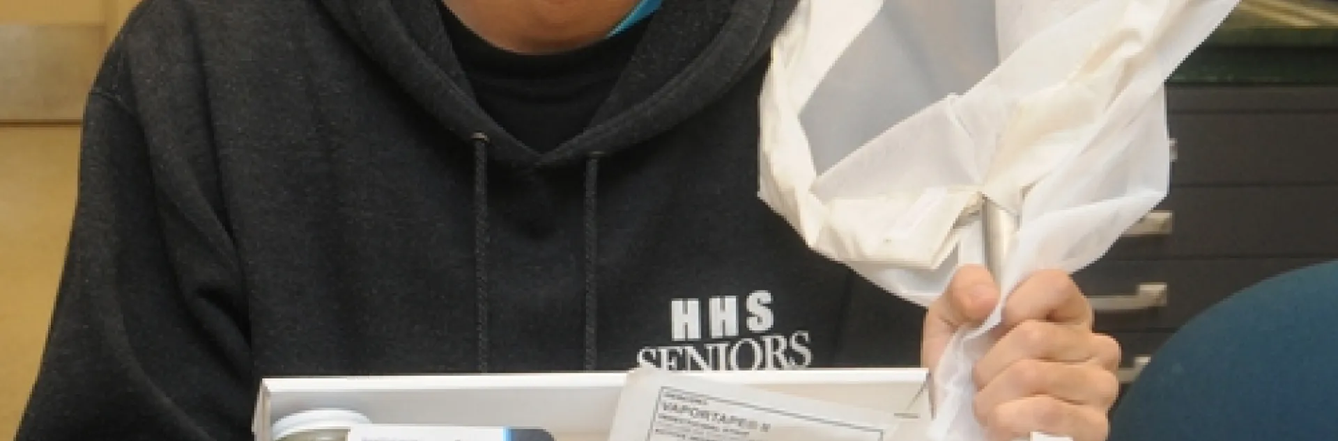 UC DAVIS entomology major Joel Hernandez, a student assistant at the Bohart Museum of Entomology, shows one of the insect collection kits available in the gift shop. Martha Stewart listed the Bohart Museum insect collection kit as one of the top three gifts to get young naturalists. Hernandez acquired one at age 7. (Photo by Kathy Keatley Garvey)