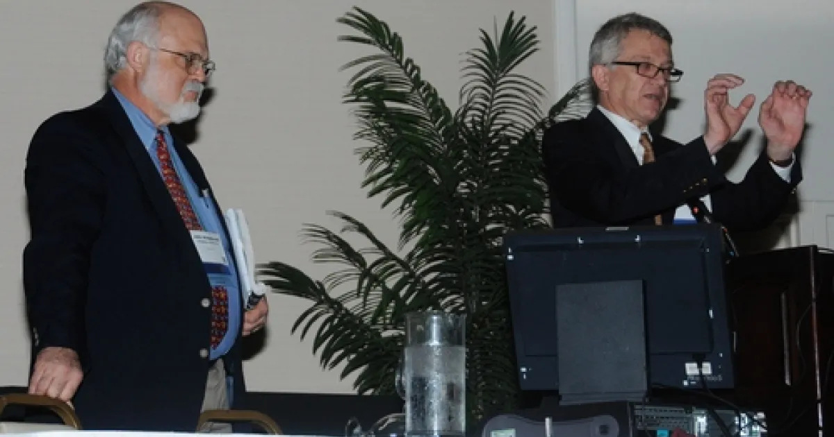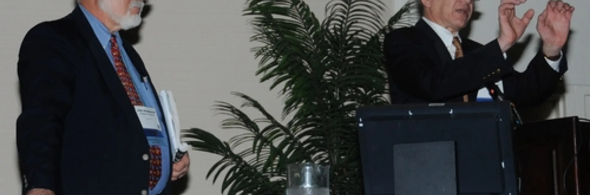 CHEMICAL ECOLOGISTS John Hildebrand (left) of the University of Arizona and Walter Leal of the University of California, Davis, organized and moderated a lively discussion at their seminar at the Entomological Society of America's 58th annual meeting, held recently in San Diego. (Photo by Kathy Keatley Garvey)