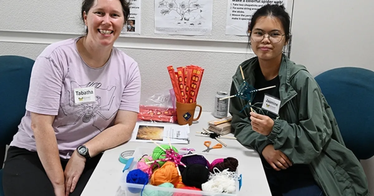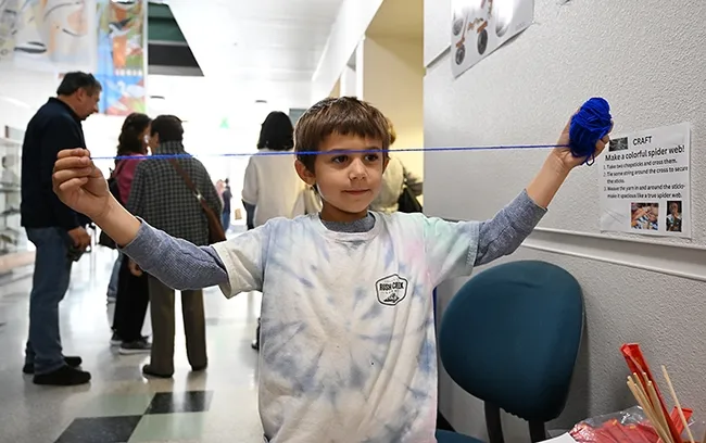 UC Davis student Jasmine Chow, an undergraduate researcher and a Bohart Museum intern, showed the attendees how to craft a spider web.
