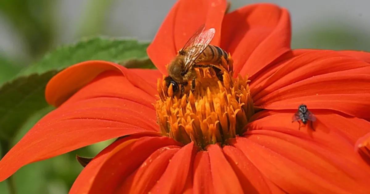 Meanwhile, here's an image BEFORE the freeze. A honey bee is nectaring on a Mexican sunflower, Tithonia rotunidfola, while a fly seeks a share.