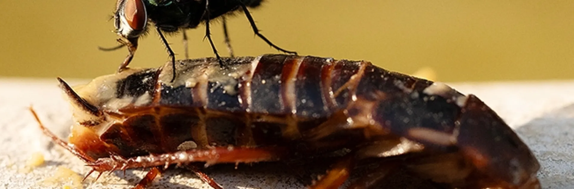 The scenario: a large cockroach drowned in a small water trough located near downtown Vacaville, Calif., and when the water drained, the roach slid out. It proved to be a feast for green bottle flies.
