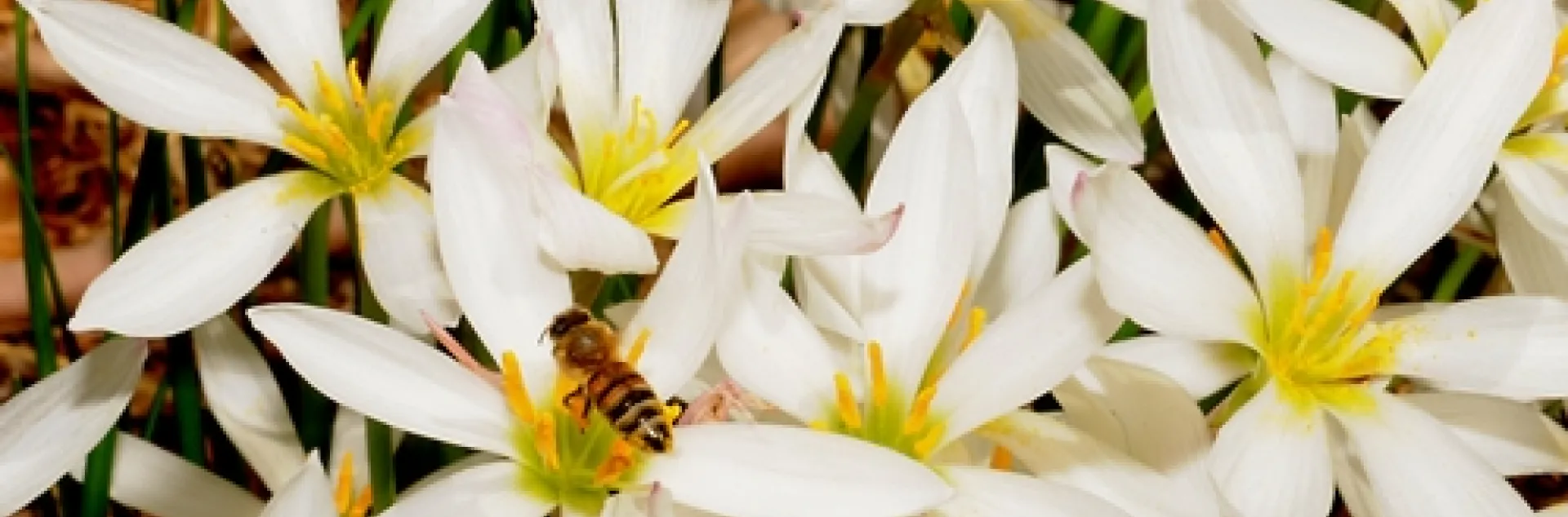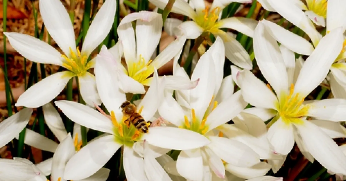 The Argentine Rain Lily (Zephyranthes candida), also known as the White Rain Lily, White Fairy Lily and White Zephyr Lily, is drawing a few honey bees, but the bees like the lavender and sage best.