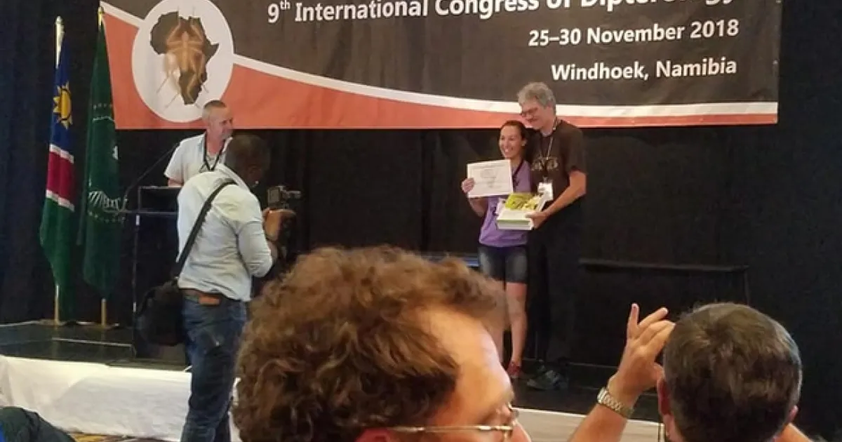She just won the prize for best student presentation at the recent 9th International Congress of Dipterology in Windhoek, Namibia.