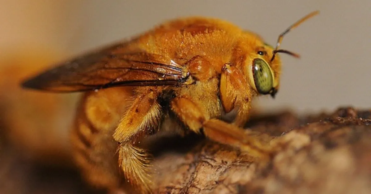 It's a green-eyed, fluffy golden insect that's nicknamed "teddy bear." You can hug it, too. Unlike the females, male carpenter bees don't sting.