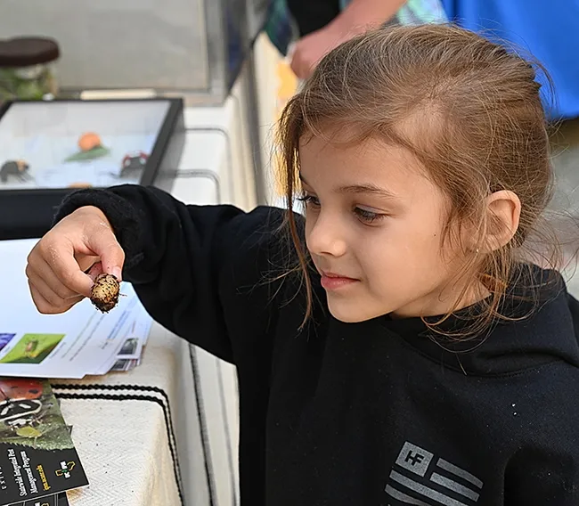 Teagan Pelusi, 4, of Pleasant Hill, is fascinated by a green fruit beetle larva. "We love learning about bugs," said her father Christopher Van Steyn, as the larva captivated her interest. (Photo by Kathy Keatley Garvey)