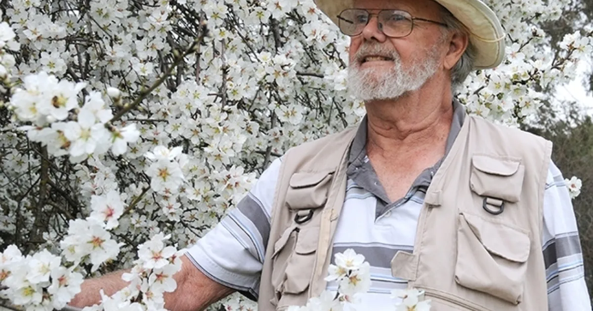 The legendary Robbin Thorp in front of an almond tree on Bee Biology Road, UC Davis campus. (Photo by Kathy Keatley Garvey)