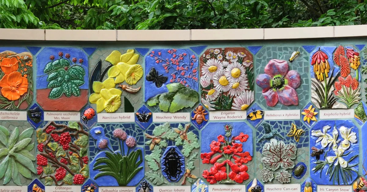 Jane Goodall would have loved this: a dog depicted among the flowers and insects in the UC Davis Art/Science Fusion Program’s ceramic-mosaic mural, “Nature’s Gallery,” in the UC Davis Arboretum and Public Garden.