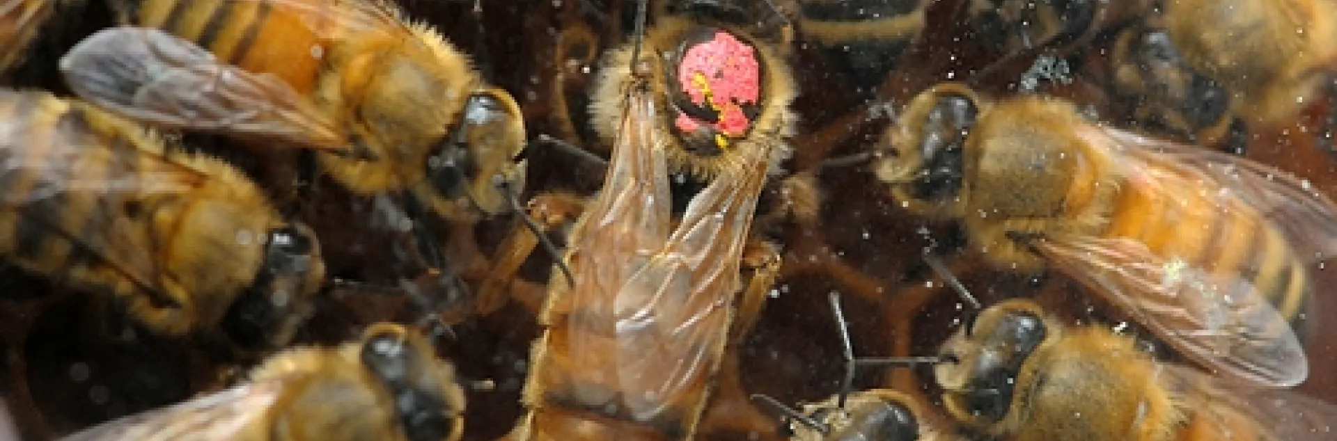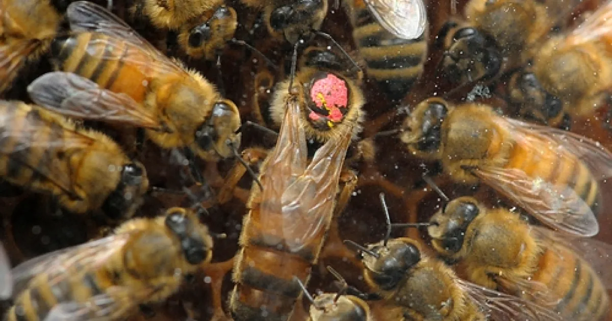 If you look closely, you'll observe the foragers performing their waggle and round dances and the royal attendants circling the queen in a retinue.