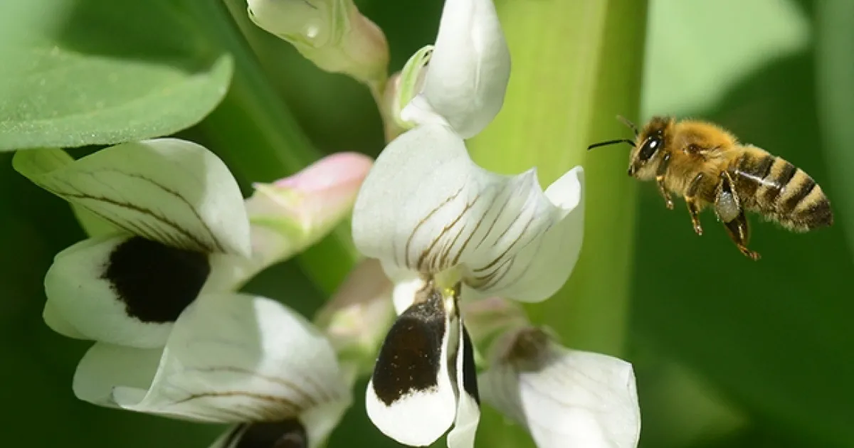 Every time we see honey bees pollinating fava bean blossoms, we think of actor Anthony Hopkins.