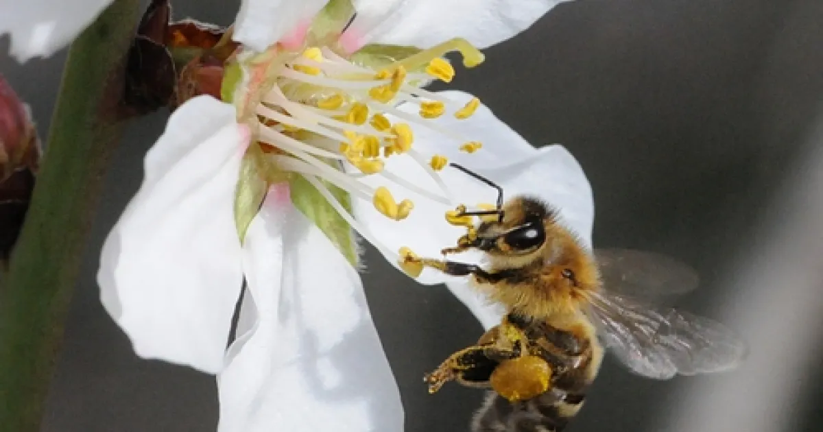 The bees are buzzing in and around the almond blossoms, collecting nectar and pollen for their hives. Nectar provides the carbohydrates for the hive, and pollen provides the proteins.