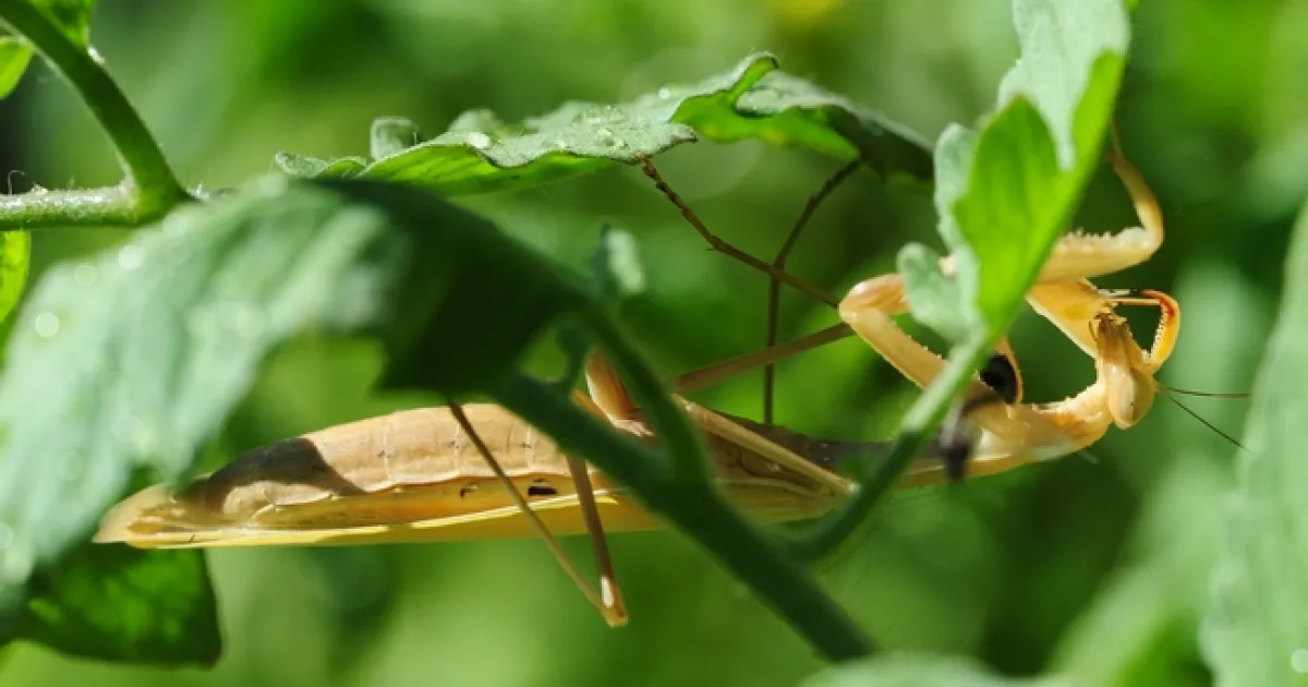 While watering the tomato plants recently, we discovered a praying mantis beneath the leaves. Looking quite defensive, it emerged from its hiding place, not to prey but to check out the spray.
