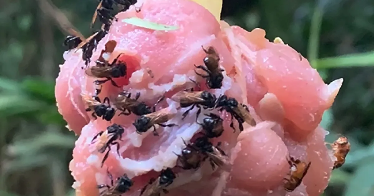 "The baits successfully attracted vulture bees and related species that opportunistically feed on meat for their protein," wrote Jules Bernstein. "Normally, stingless bees have baskets on their hind legs for collecting pollen. However, the team observed carrion-feeding bees using those same structures to collect the bait." McFrederick called them "little chicken baskets."