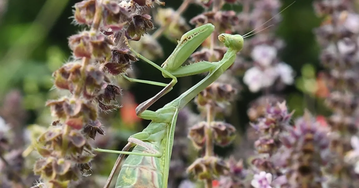 A gravid praying mantis, Stagmomantis limbata, crawls out of a patch of African blue basil, and begins checking out the honey bees.
