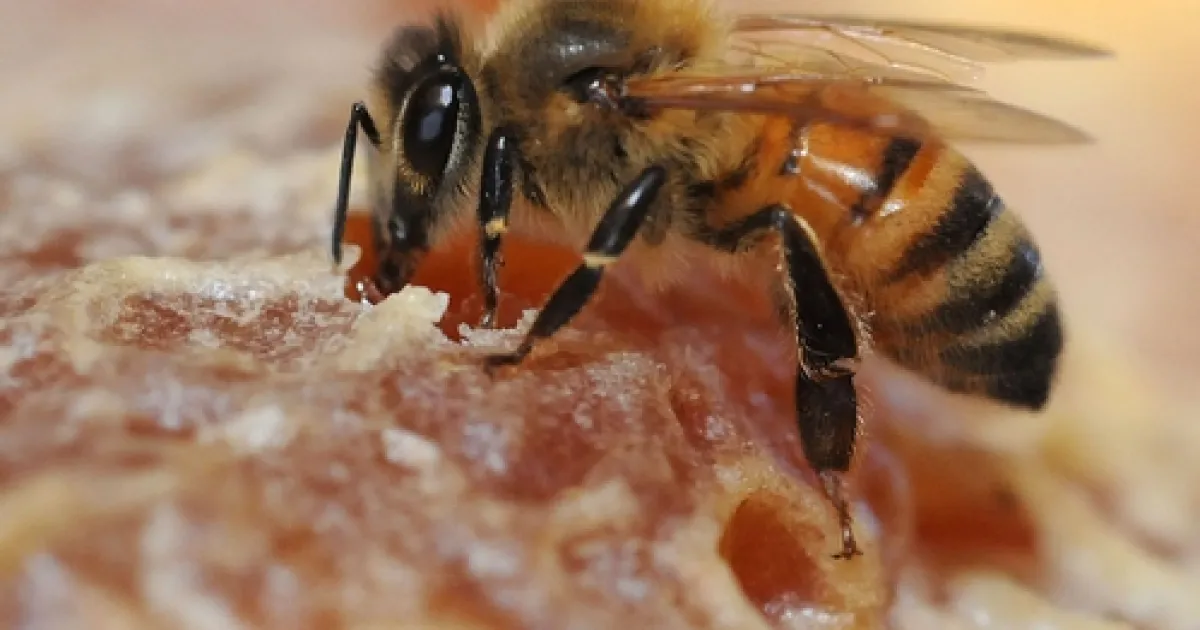 HONEY BEE at the Harry H. Laidlaw Jr. Honey Bee Research Facility at the University of California, Davis, samples honey. (Photo by Kathy Keatley Garvey)