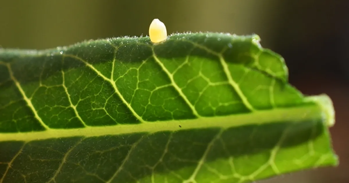 A monarch butterfly just deposited this egg on a milkweed leaf. (Photo by Kathy Keatley Garvey)