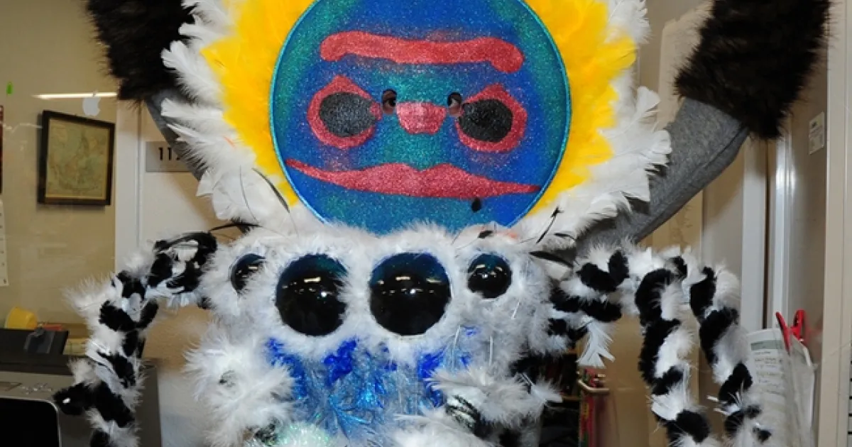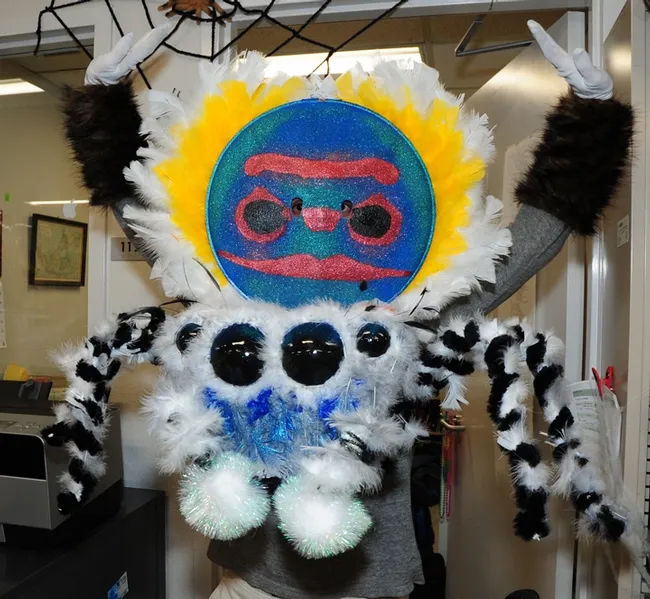 The best costume at the Bohart Musuem's recent Halloween party was of a peacock jumping spider, designed, created and worn by UC Davis entomology undergraduate student Wade Spencer.