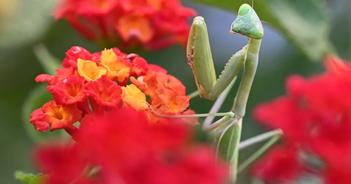 This female praying mantis, a Stagmomantis limbata, selects a patch of red Lantana to watch for pollinators.