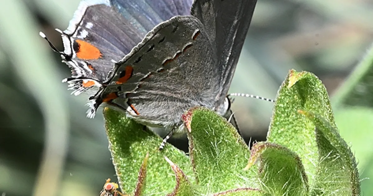 But so are the wings of the gray hairstreak butterfly. That orange spot with a black dot on the hindwing probably resembles an eye to a predator.