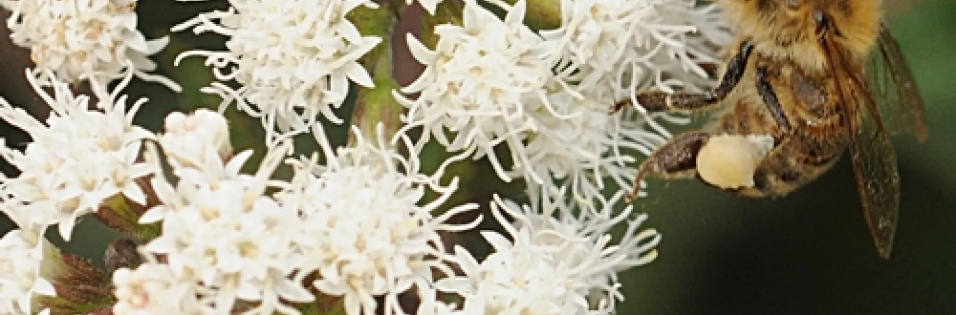 HONEY BEE forages on Joe-Pye Weed, a perennial that blooms in the late summer and early fall. (Photo by Kathy Keatley Garvey)