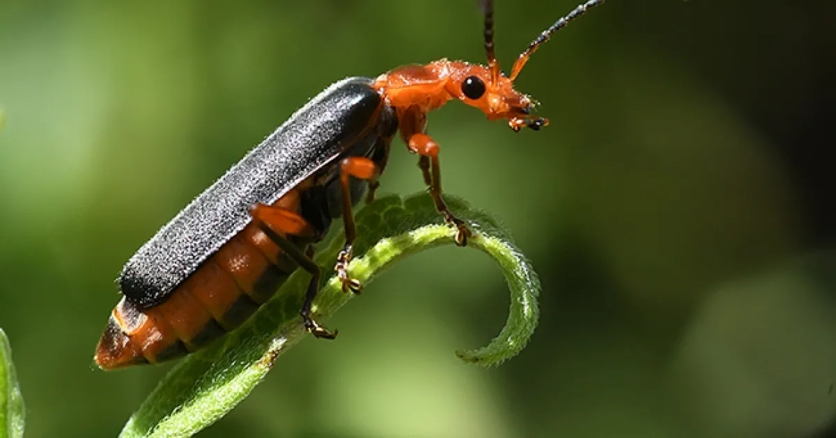 "The adults are long and narrow," according to the UC Statewide Integrated Pest Management Program (UC IPM), which labels them as natural enemies of garden pests. "Common species are often about 1/2 inch (13 mm) long with a red, orange or yellow head and abdomen and black, gray or brown soft wing covers. Adults are often observed feeding on aphids or on pollen or nectar on flowering shrubs and trees. Metamorphosis is complete. Larvae are dark, elongate, and flattened. They feed under bark or in soil or litter, primarily on eggs and larvae of beetles, butterflies, moths, and other insects. There are over 100 species of soldier beetles in California."