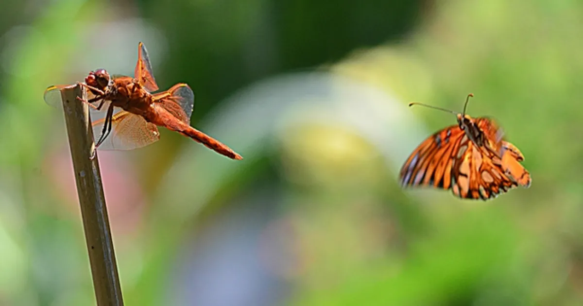 Whoa! What's this? A Gulf Fritillary butterfly (Agraulis vanillae)--probably a male searching for a female or a territorial male protecting his turf--is rapidly approaching. The flameskimmer isn't about to move. After all, there's a "dragon" in his name and hunting is his game. He holds his ground. Er, his perch.