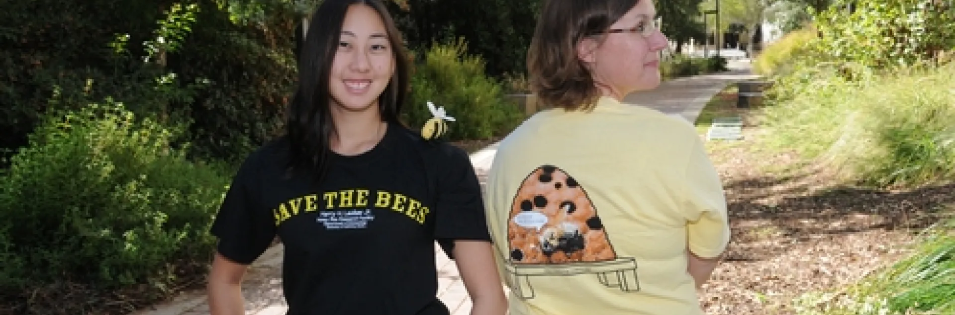 Fran Keller, a doctoral candidate in entomology, and Nanase Nakanishi, a senior animal science major, teamed to create a "Save the Bees" T-shirt, spotlighting the Harry H. Laidlaw Jr. Honey Bee Research Facility and the adjacent Häagen-Dazs Honey Bee Haven.