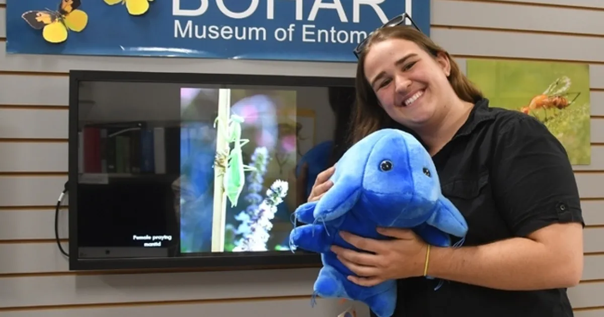 Bohart associate Emma Cluff cuddles a tardigrade, one of the stuffed animals available for sale in the Bohart Museum of Entomology's gift shop. (Photo by Kathy Keatley Garvey)