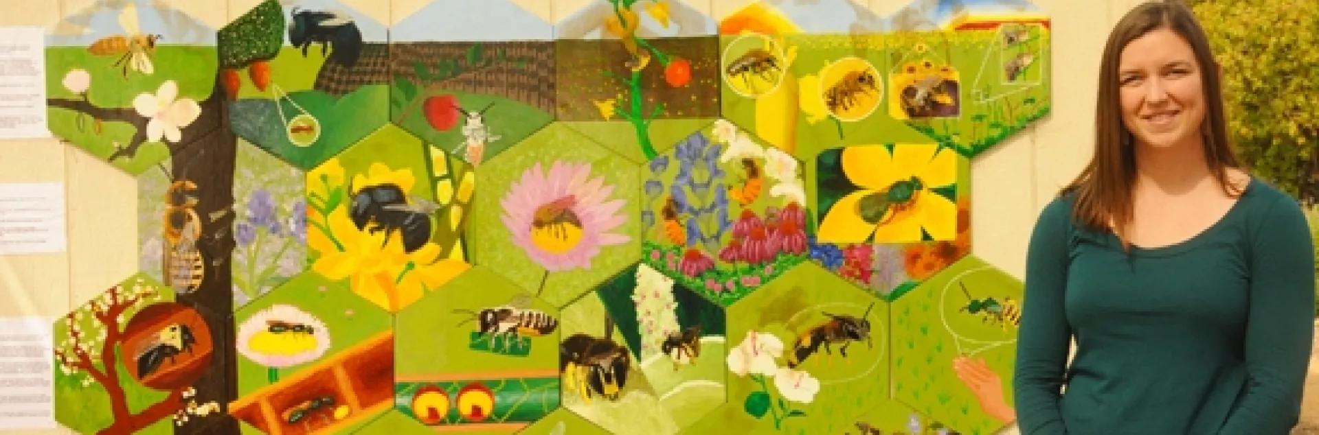 But back to the bee mural. Then doctoral student Sarah Dalrymple of the Rick Karban lab,  served as the graphics project coordinator and teaching assistant, guiding the students on design, creation and installation of the panels. She went on to be named the 2011 recipient of the UC Davis Outstanding Graduate  Student Teaching Award and praised for fusing the boundaries of biology, art and culture.