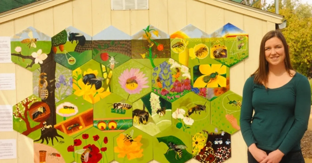 Sarah Dalrymple, then a doctoral candidate at UC Davis, coordinated the bee mural in the Häagen-Dazs Honey Bee Haven. (Photo by Kathy Keatley Garvey)