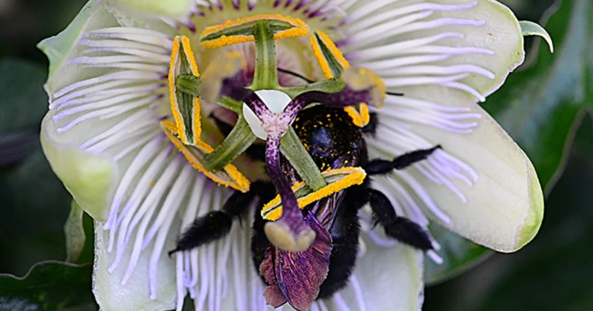 It was early morning on Tuesday, June 7, when we spotted a female Valley carpenter bee, Xylocopa sonorina, asleep on a passionflower vine, Passiflora. That's the host plant for the Gulf Fritillary, Agraulis vanillae, but carpenter bees are always hanging around for pollination. Tiny grains of golden pollen cling to this bee look like gold dust.