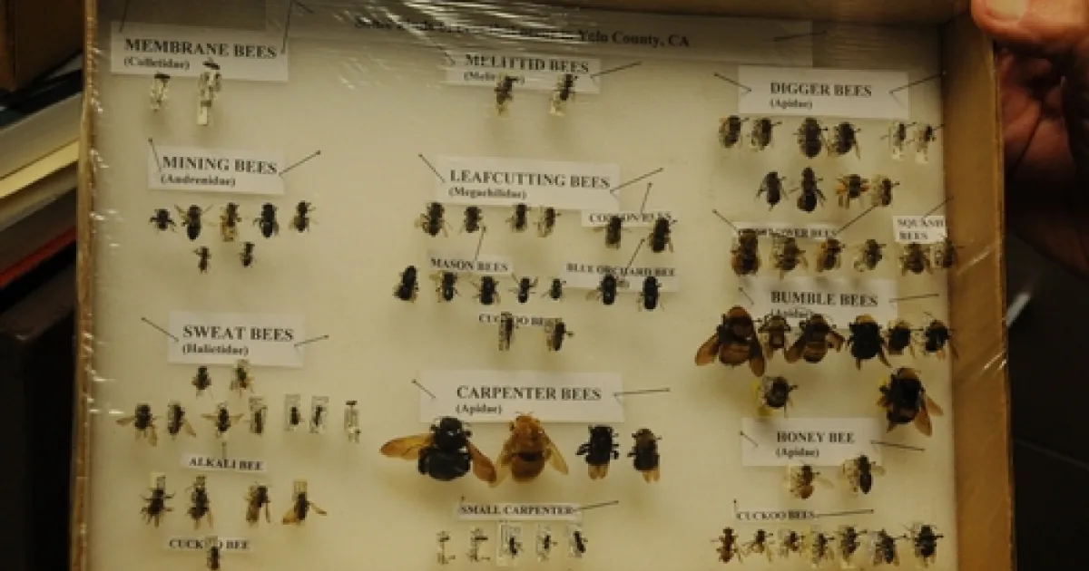 THIS COLLECTION of bees, by native pollinator specialist Robbin Thorp, shows the wide diversity of bees in Yolo County. (Photo by Kathy Keatley Garvey)