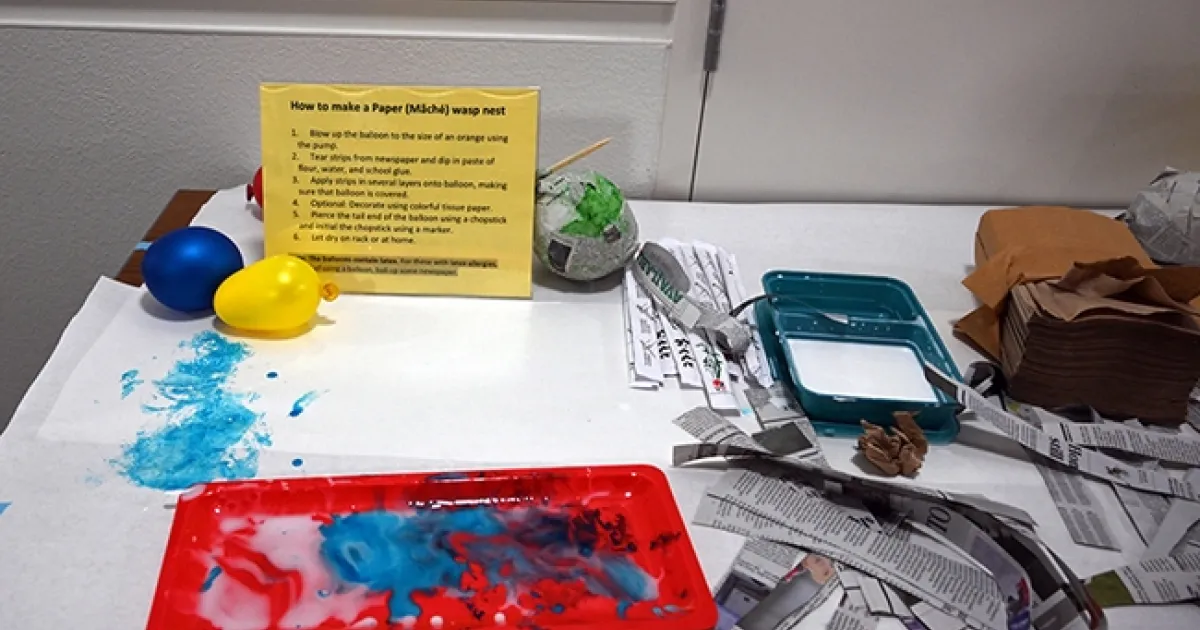 The family activity? To create a paper mache wasp nest, using a balloon, newspapers, a pump, a marker, a chopstick, and a paste of flour, water and school glue.