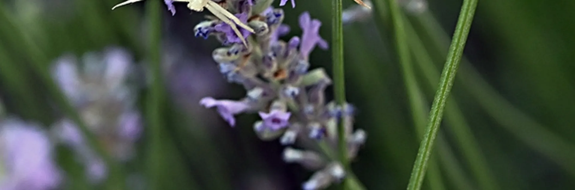 A crab spider, family Thomisidae, lies motionless in a patch of lavender, waiting to ambush a honey bee.