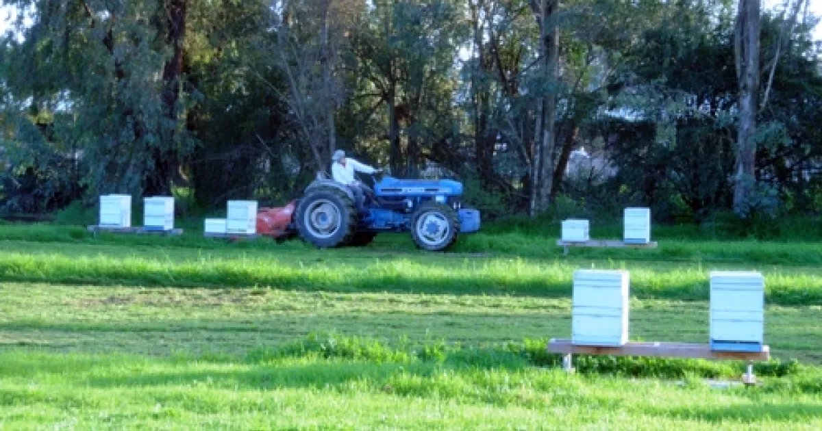 Today bee breeder-geneticist Michael "Kim" Fondrk mowed the lush green grass around the apiary. Bee breeder-geneticist Susan Cobey, manager of the Laidlaw facility, continued preparing for a series of specialized bee courses. She tended the hives with beekeeper and junior specialist Elizabeth Frost and beekeeper Tylan Selby, a first-year entomology student.