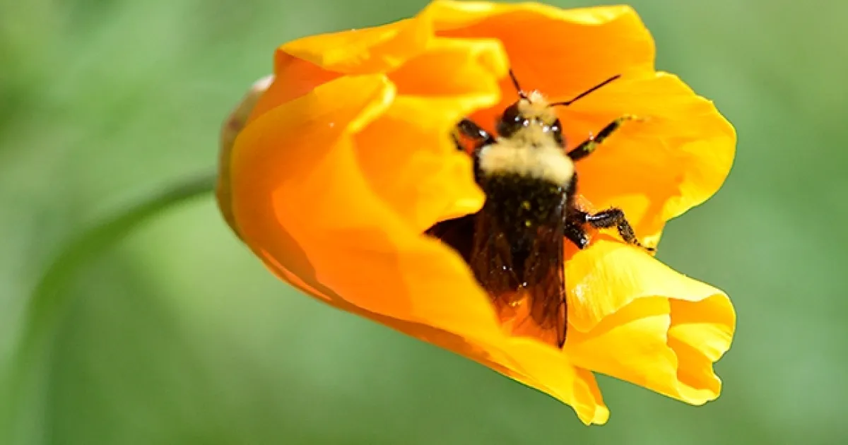 A yellow-faced bumble bee,Bombus vosnesenskii, buzzes into a barely opened California golden poppy in a Vacaville garden. (Photo by Kathy Keatley Garvey)