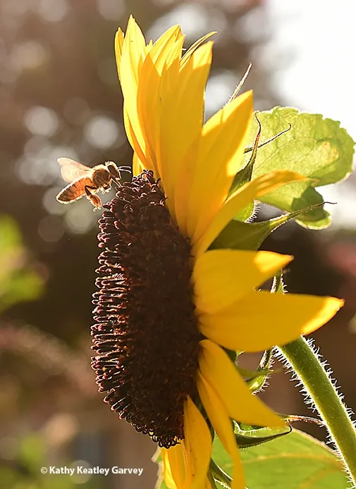 A honey bee heading toward an east-facing sunflower in Vacaville, Calif. (Photo by Kathy Keatley Garvey)