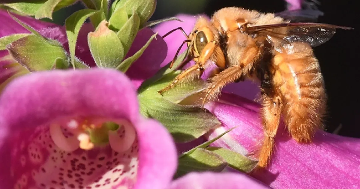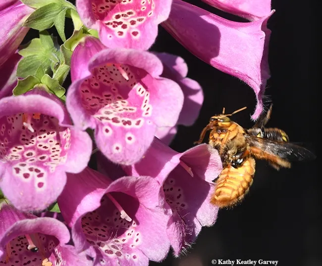 In this corner, meet Mr. Teddy Bear. He's a blond, green-eyed carpenter bee, Xylocopa varipuncta, a native, and one of three species of carpenter bees commonly found from northern to southern California to western New Mexico.