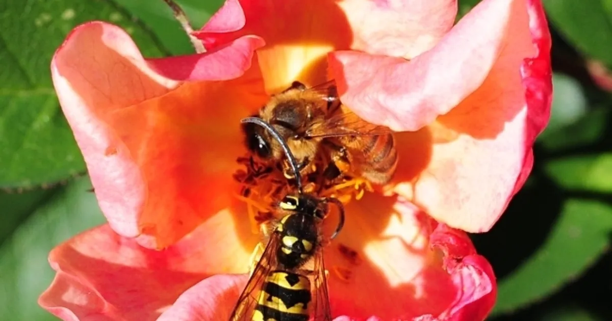A honey bee and a Western yellowjacket meet on a rose at a UC Davis bee garden. Both are pollinators. (Photo by Kathy Keatley Garvey)
