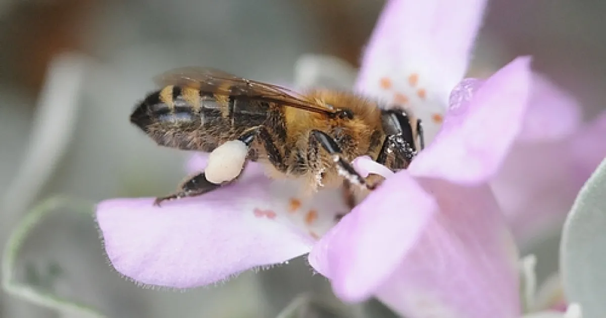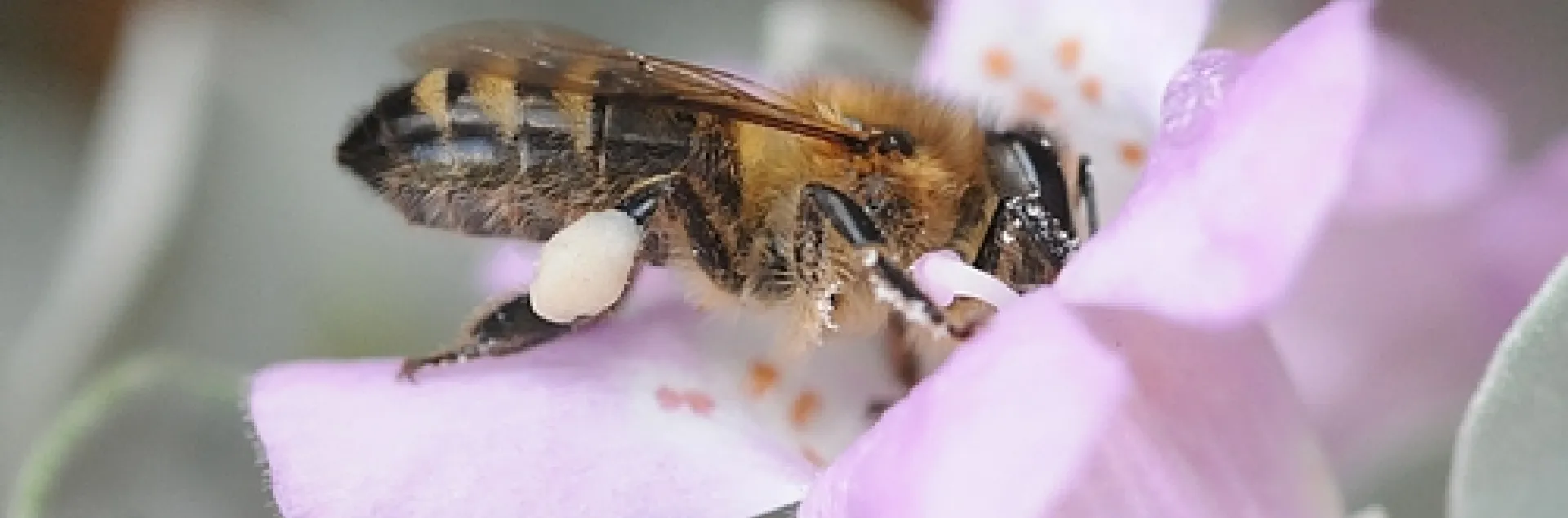 PRETTY IN PINK--A honey bee in the UC Davis Arboretum. (Photo by Kathy Keatley Garvey)
