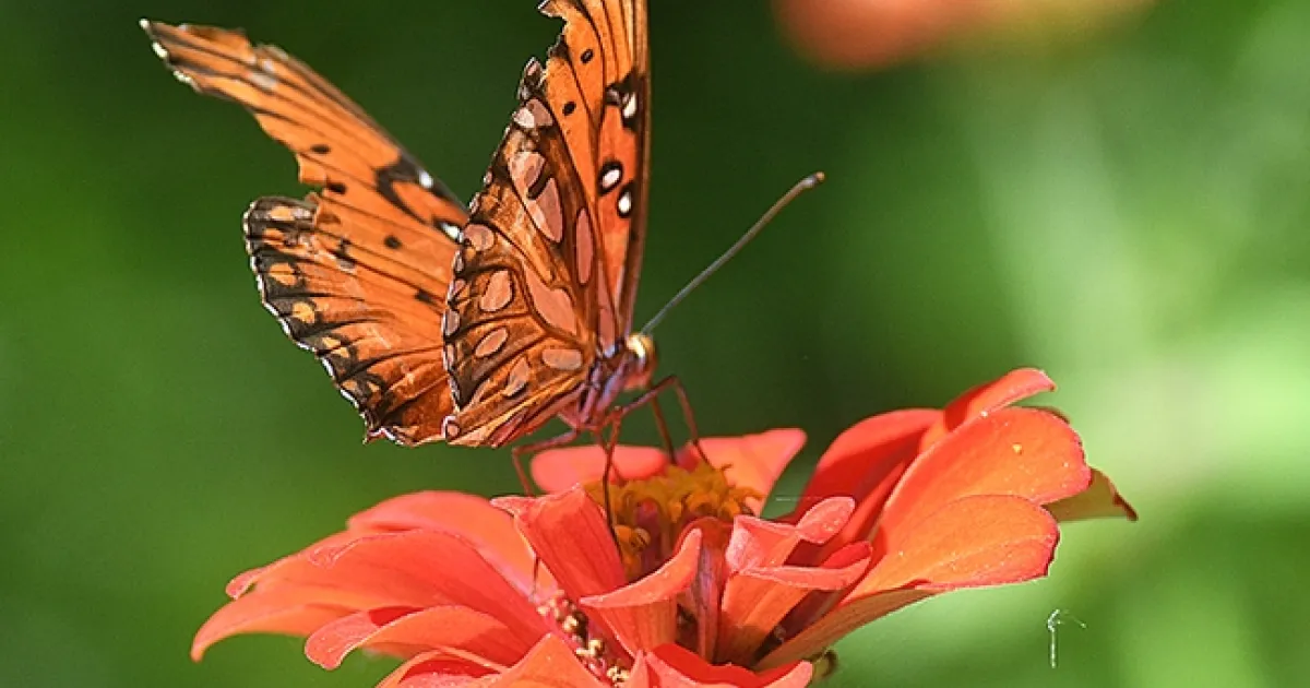 A tattered Gulf Fritillary sipping nectar from a zinnia in a Vacaville, Calif., garden. (Photo by Kathy Keatley Garvey)