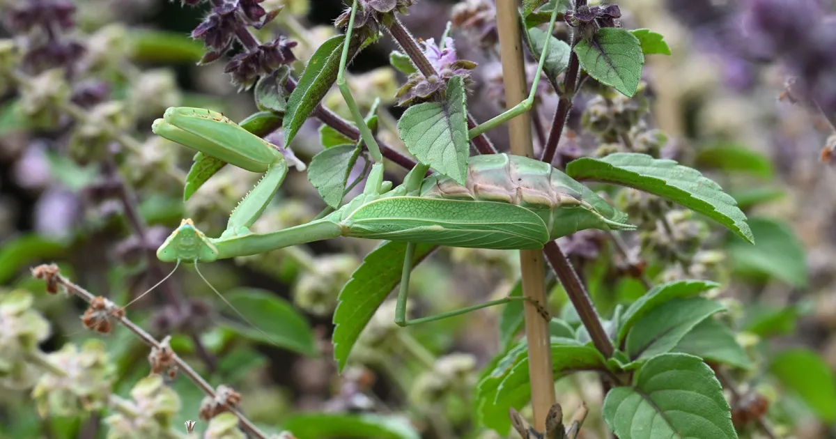 A praying mantis, Stagmomantis limbata, is hanging out in a patch of African blue basil in a Vacaville garden.