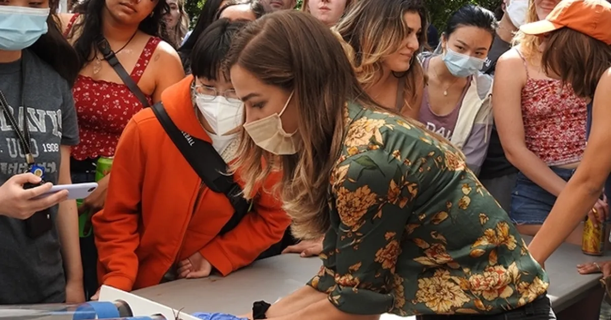 Britanny Kohler, then a member of the UC Davis Entomology Club, works the roach race track in this 2022 image. She is a UC Davis alumna and a research associate at the Bohart Museum of Entomology. (Photo by Kathy Keatley Garvey)