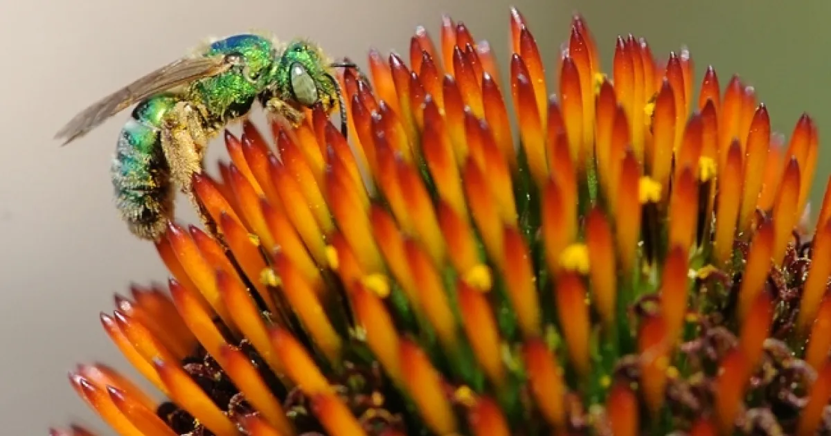 The female metallic green sweat bee, Agapostemon texanus, is green. The males are partly green; their head and thorax are green, but not their abdomen.