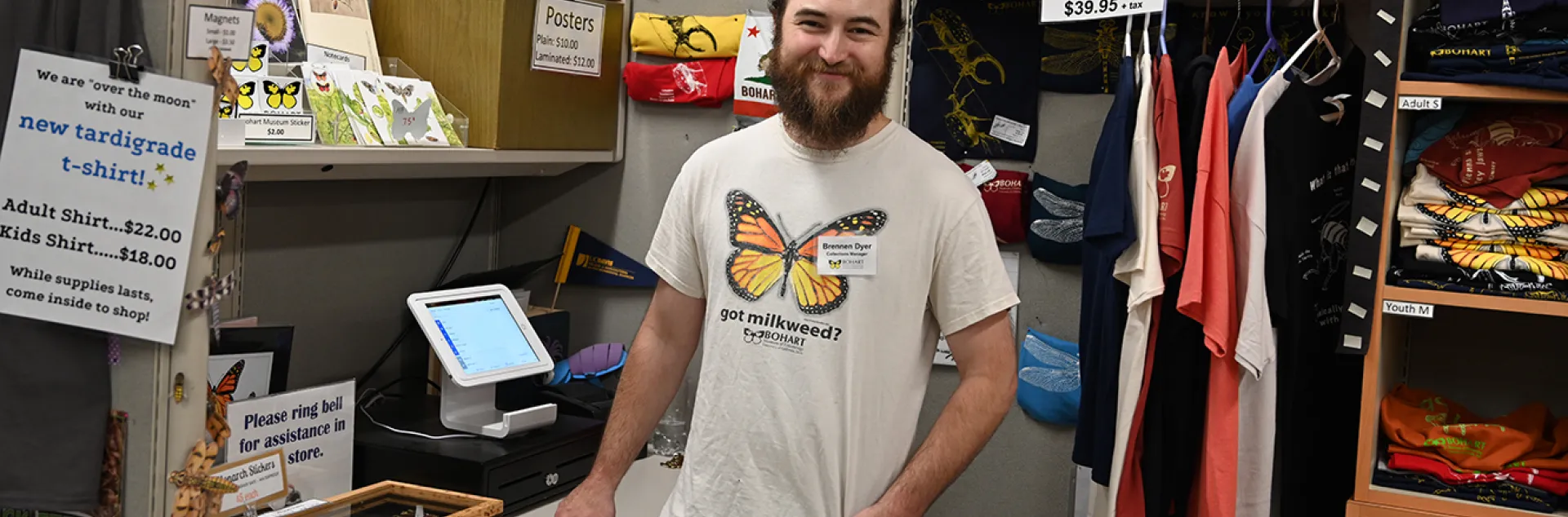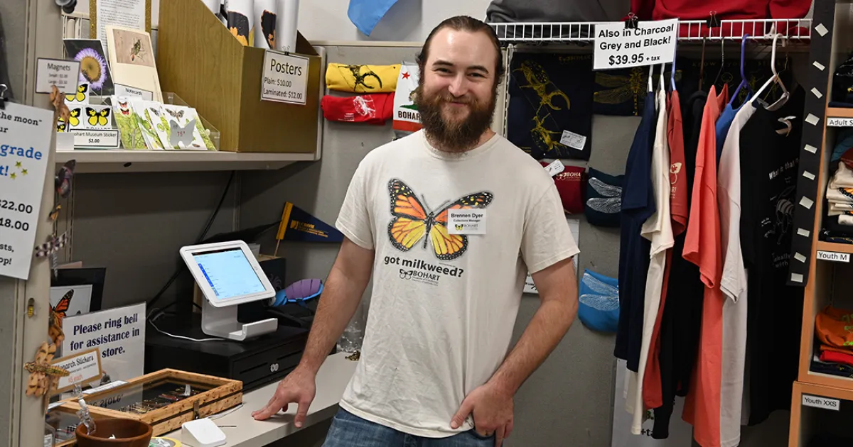 Cover image: Brennen Dyer, Bohart Museum collections manager, staffing the gift shop. (Photo by Kathy Keatley Garvey)
