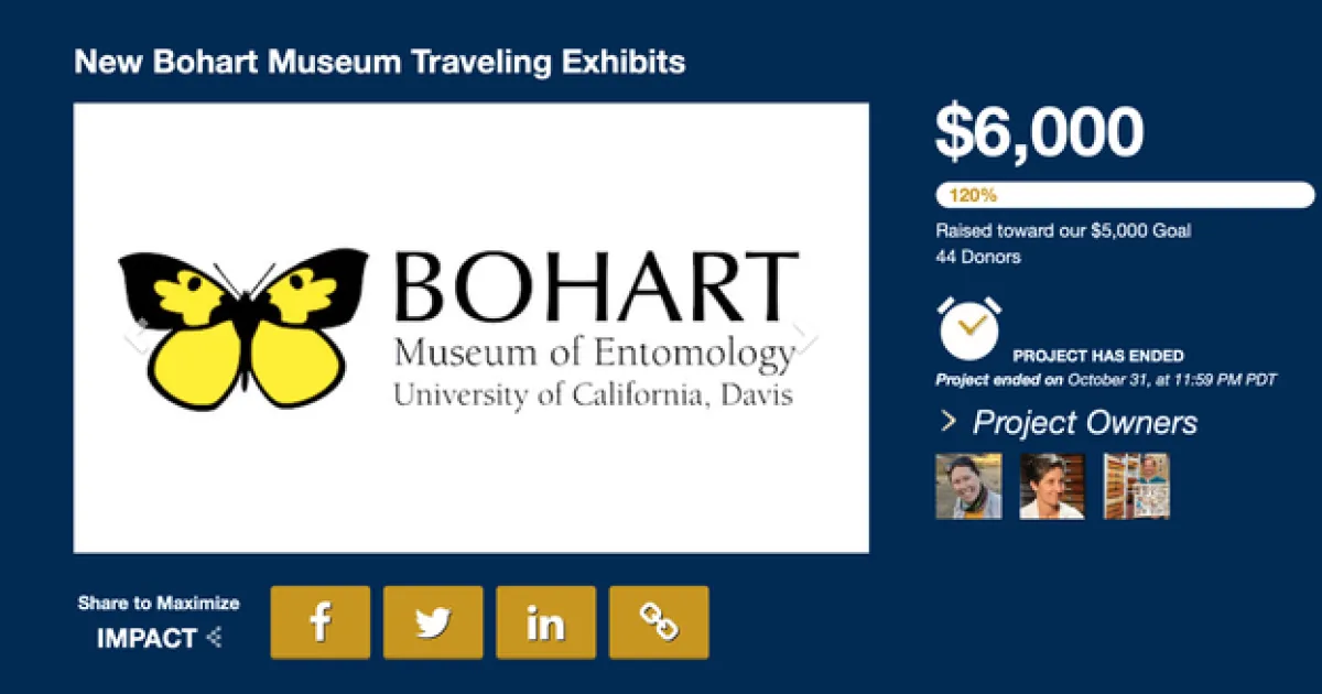 As they say on their website: "The Bohart Museum of Entomology is a research collection and public museum dedicated to understanding, documenting and communicating terrestrial arthropod diversity. In our 75th year, the Bohart has maintained a robust outreach program that typically connects with over 10,000 people each year. Portable educational boxes have been a great way for us to share the museum experience with others. Housed in the same specimen boxes that we use for the research collection, these displays travel all over Northern California to festivals, events, museums, hospitals and classrooms. UC Davis students, staff, teachers and scout leaders routinely borrow these materials to enrich their programs."