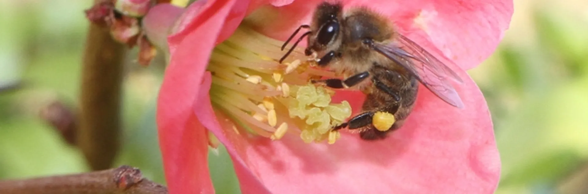 The flowering quince (genus Chaenomeles) from the rose family (Rosaceae) is among the first flowers of the new year to bloom. The soft pinks loaded with gold--yellow pollen--are the best!